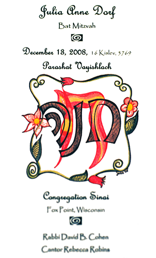 Julie will consult with you to create an image that will reflect the special occasion being celebrated. Whether it’s a Bar or Bat Mitzvah, a wedding, or any other celebration, the artist will exemplify the importance of the event through a clear depiction of those it is being made for.